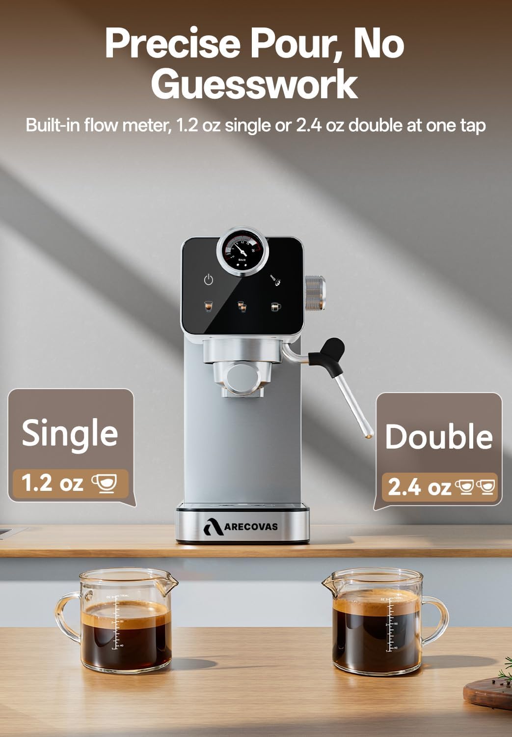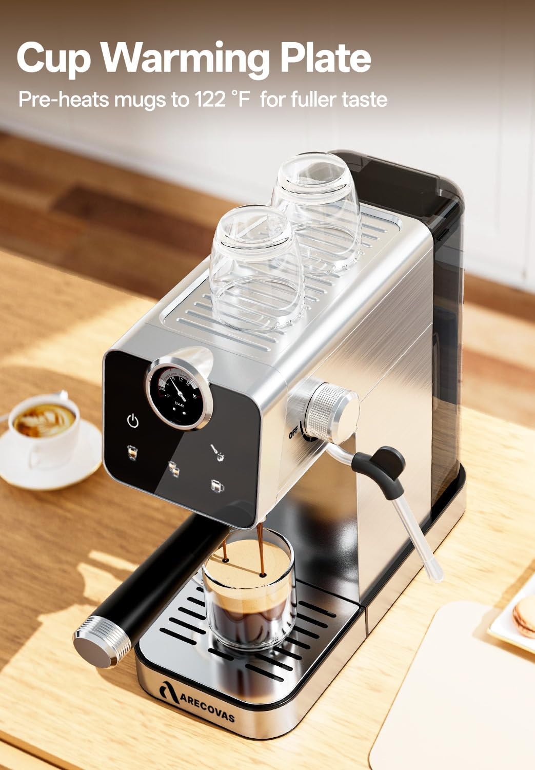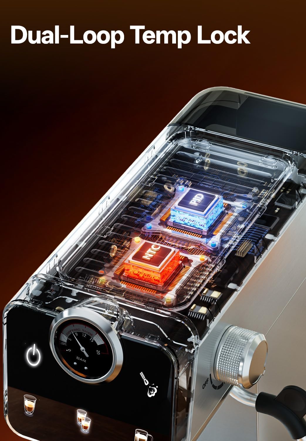 โ๐๐ซ๐จ๐๐๐ฌ๐ฌ๐ข๐จ๐ง๐๐ฅ 20 ๐๐๐ซ ๐๐ซ๐๐ฌ๐ฌ๐ฎ๐ซ๐: Embrace barista-style brewing with Arecovas espresso machine! With a 20-bar pressure system and a robust 1300W boiler, the espresso maker extracts premium coffee for lattes, cappuccinos, and more ๐ง๐๐ซ๐๐๐ข๐ฌ๐ ๐๐๐ฆ๐ฉ๐๐ซ๐๐ญ๐ฎ๐ซ๐ ๐๐จ๐ง๐ญ๐ซ๐จ๐ฅ: The embedded PID algorithm and dual NTC sensors actively stabilize brew and steam temperatures to within ยฑ2ยฐC, guaranteeing full flavor release, consistent crema color and silky micro-foam for every single or double shot you pull ๐ซ๐๐ซ๐-๐๐ง๐๐ฎ๐ฌ๐ข๐จ๐ง ๐