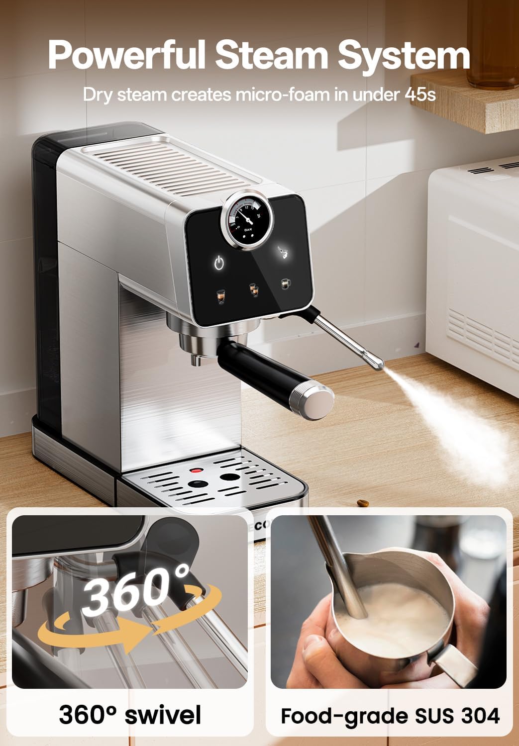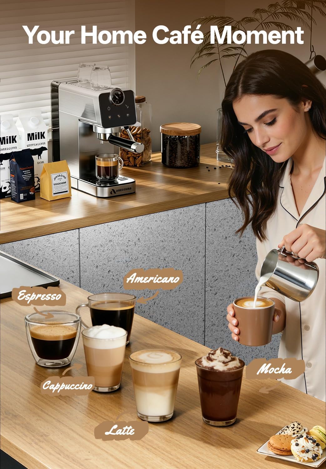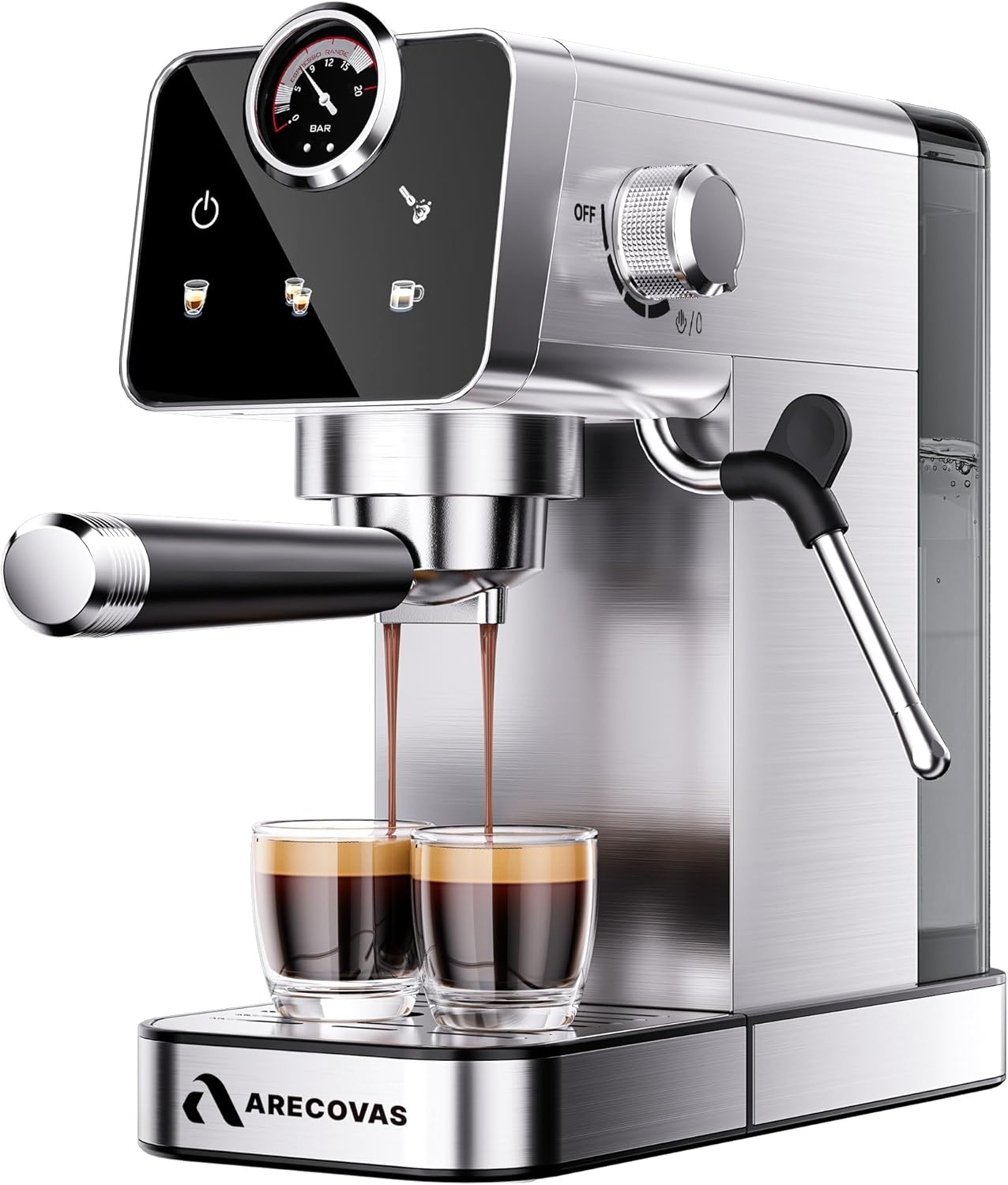 โ๐๐ซ๐จ๐๐๐ฌ๐ฌ๐ข๐จ๐ง๐๐ฅ 20 ๐๐๐ซ ๐๐ซ๐๐ฌ๐ฌ๐ฎ๐ซ๐: Embrace barista-style brewing with Arecovas espresso machine! With a 20-bar pressure system and a robust 1300W boiler, the espresso maker extracts premium coffee for lattes, cappuccinos, and more ๐ง๐๐ซ๐๐๐ข๐ฌ๐ ๐๐๐ฆ๐ฉ๐๐ซ๐๐ญ๐ฎ๐ซ๐ ๐๐จ๐ง๐ญ๐ซ๐จ๐ฅ: The embedded PID algorithm and dual NTC sensors actively stabilize brew and steam temperatures to within ยฑ2ยฐC, guaranteeing full flavor release, consistent crema color and silky micro-foam for every single or double shot you pull ๐ซ๐๐ซ๐-๐๐ง๐๐ฎ๐ฌ๐ข๐จ๐ง ๐